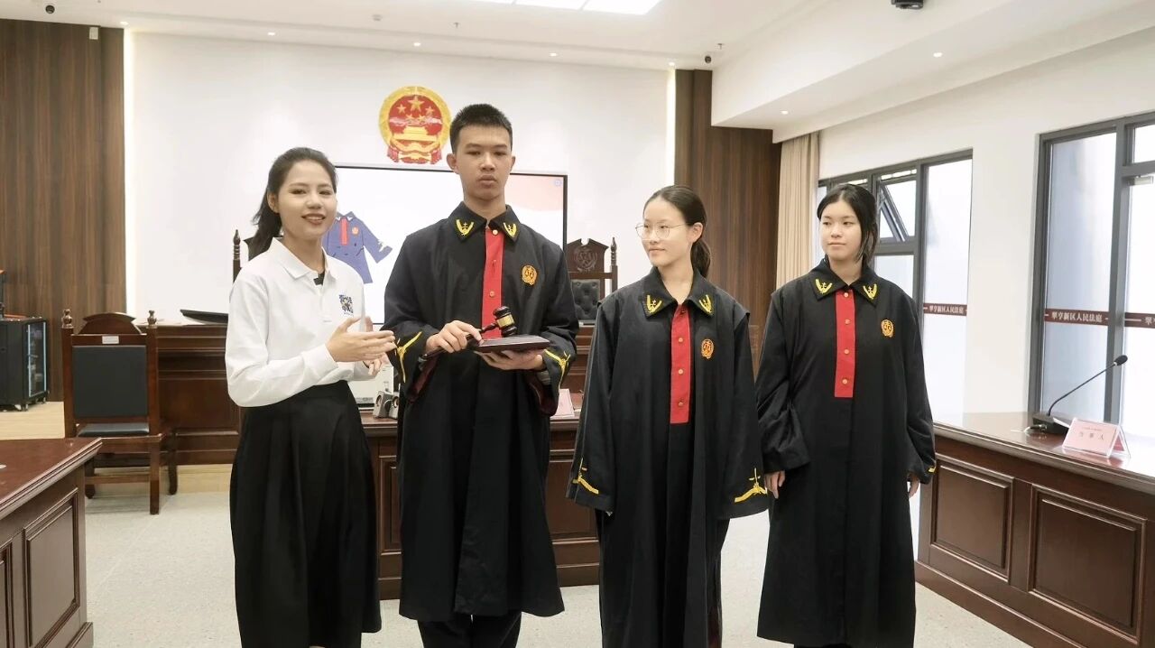 12月4日,第十二个国家宪法日如期而至,人民法院新闻传媒总社联合最高人民法院新闻局在全国组织多场普法直播活动。作为分会场之一,中山市第一人民法院立足粤港澳大湾区法治建设定位,以场景化体验、互动式普法为核心,在翠亨新区人民法庭与迪茵公学同步开展特色法治活动,让62名中山纪念中学港澳班学生及近700名迪茵公学港澳台学生沉浸式感受司法文化交融魅力,筑牢湾区青年法治认同根基。 毗邻深中通道的翠亨新区人民法庭,是服务粤港澳深度融合的新设法庭。当天,62名港澳班学生以“法治体验官”身份走进法庭,开启了一场全方位的司法实践之旅。从亲身体验安检流程、聆听“要素式起诉状”要点讲解,到参与模拟调解、试穿法袍、集体诵读宪法,学生们循着司法工作链条,直观感受湾区特色法庭的运行机制与文化氛围。“原来法官的法袍不仅象征权威,更承载着公正的责任感。”香港学生宋宇皓身着法袍时的感慨,道出了众多参与者的心声。 学生们在“法治体验官”角色中感受司法温度。通讯员供图
